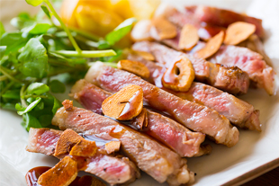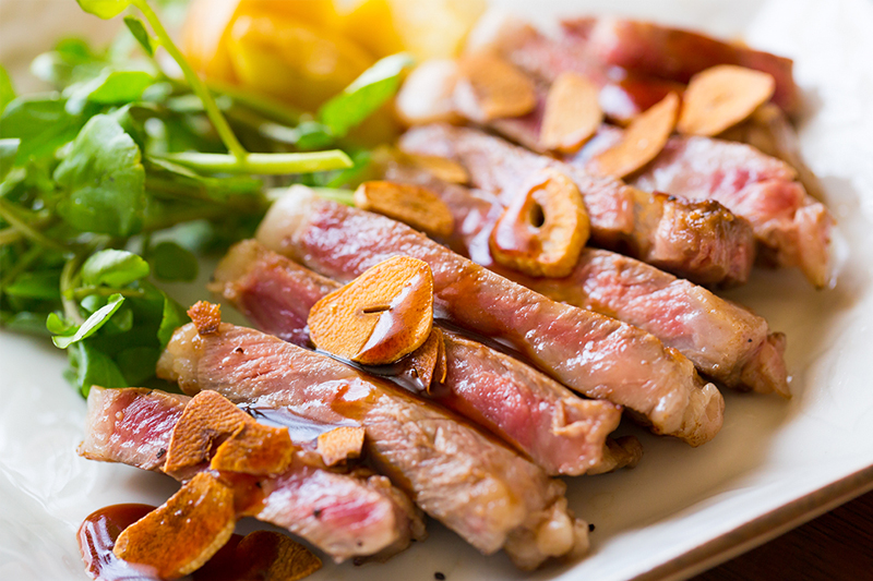 設定金額15,000円のバトルの中、ナインティナインの岡村さんが岡村牛のサーロインステーキを食し、